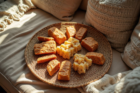 Sunlit cozy autumn snack setting with homemade biscuits and cheese. That the image is generated using AI.