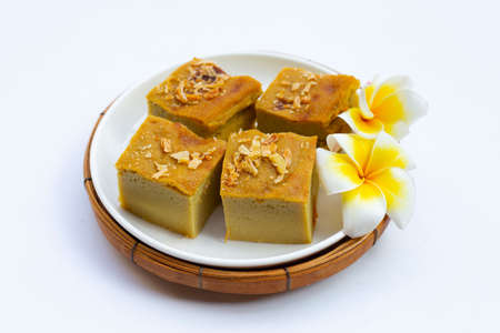 Coconut custard made from eggs with soybean and coconut milk on white background. on white bowl