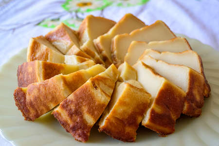 Rosy tasty sweet yellow farina pie, cut into pieces in plate on old table for tea drinking, top view