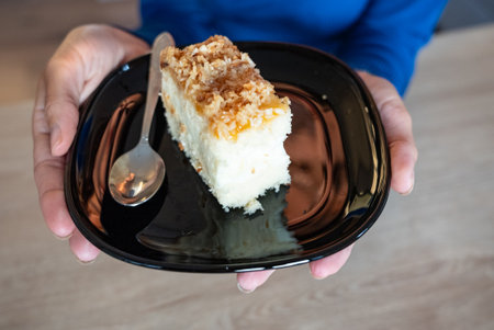 The woman holds food in her hand. The girl holds a cake on a plate. Cake on black plate.