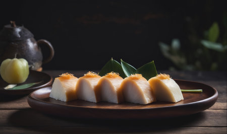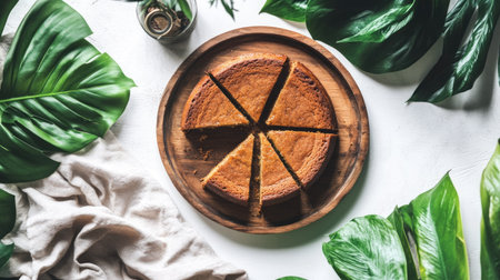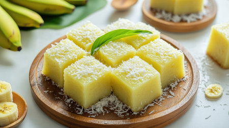 Elegant food styling of steamed banana cake served on a natural round wooden plate with tropical elements on a white background