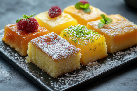 Assorted lemon, raspberry, and orange sponge cakes on a dark slate plate, garnished with mint and powdered sugar.