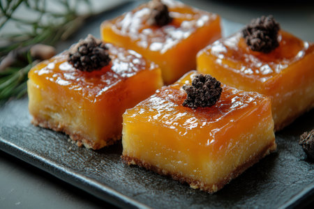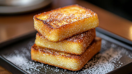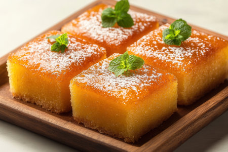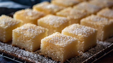 Irresistible golden brown square desserts with a sugar dusting, presented beautifully on a wooden surface. Perfect for food lovers and dessert enthusiasts.