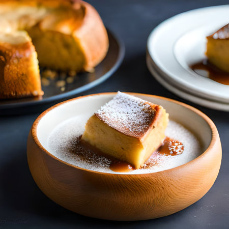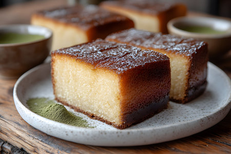 A close-up of a caramel custard cake slice, perfectly browned with a glossy top, served on a speckled white plate. accompanied by a dusting of matcha powder, creating a blend of rich sweetness and subtle bitterness, ideal for gourmet presentations. Generative AI