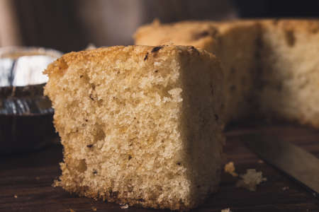 Closeup botter soft cake with lemon and cream cheese on wood board background.cake selective focus