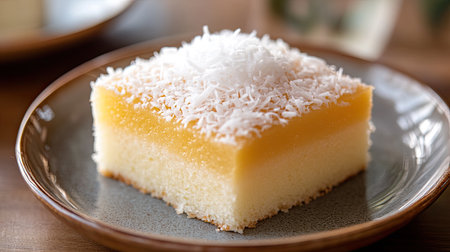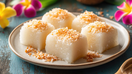 A delicious Thai sponge cake topped with a light layer of coconut flakes, served on a ceramic plate, highlighting its delicate, fluffy texture