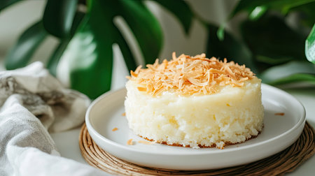 A clean white plate of steamed banana coconut cake topped with shredded coconut, with tropical leaves in the background