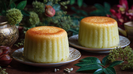 Captivating image of fluffy cakes presented on decorative plates, surrounded by lush greenery and colorful flowers, perfect for culinary inspiration.