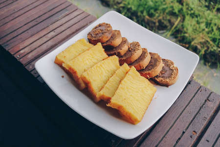 Bika Ambon and Chocolate Bolu Gulung Kukus, Indonesian traditional cake slices in white plate.