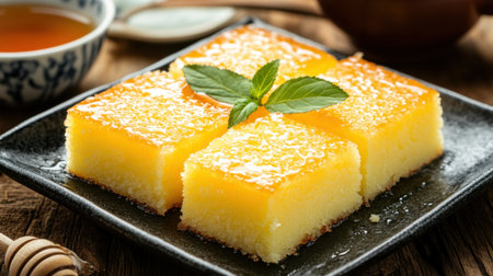 Four squares of moist, golden-brown cake, glazed and dusted with powdered sugar, garnished with fresh mint sprigs, arranged on a dark wooden square plate.