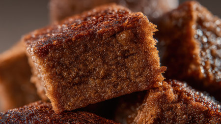 A detailed close-up view of rich brown sugar cubes piled together on a dark background, highlighting their unique texture and sweet aroma perfect for culinary images.