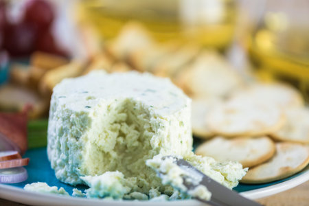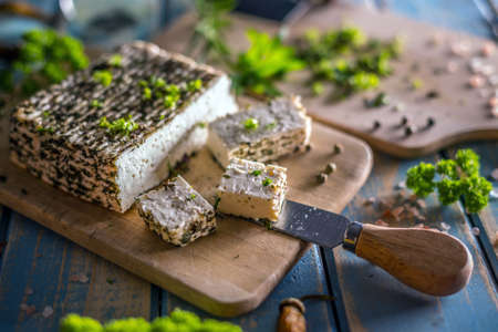 Creamy cheese with herbs on a wooden board ready for serving at a rustic gathering