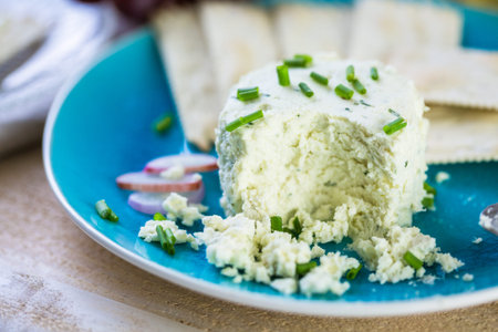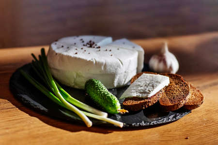 goat or sheep cheese and bread on the table