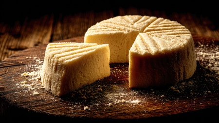 round block of cheddar cheese with wedge cut out exposing crumbly texture placed on wooden surface - ai