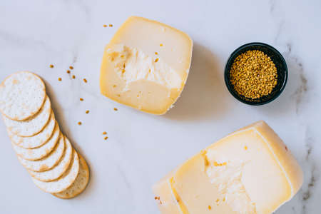 Cachotta cheese with with fenugreek, jam, baguette, crackers, rosemary and thyme on marble