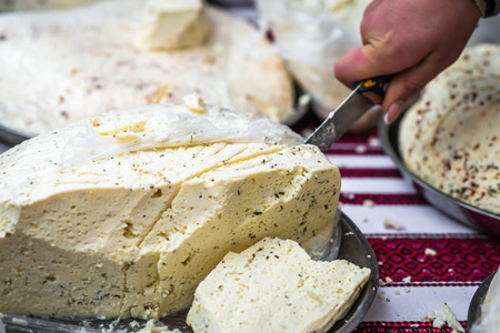 A piece of home made cheese from cow and sheep milk, known as telemea, displayed for sale at a street food market, side view of healthy food photographed with soft focus