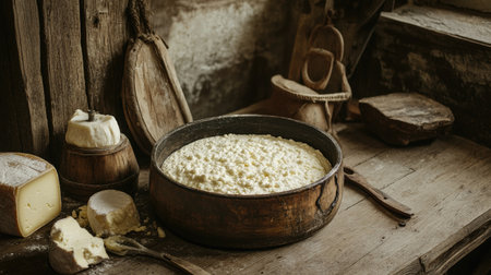A rustic wooden table scene showcasing a cheese-making process, with curds forming in a pot and traditional cheese-making tools nearby, highlighting artisanal craftsmanship.