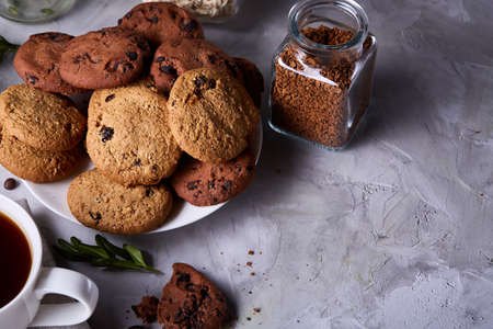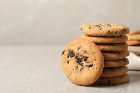 Homemade cookies with chocolate on a grey table. Chocolate chip cookie shot.