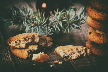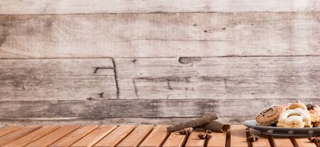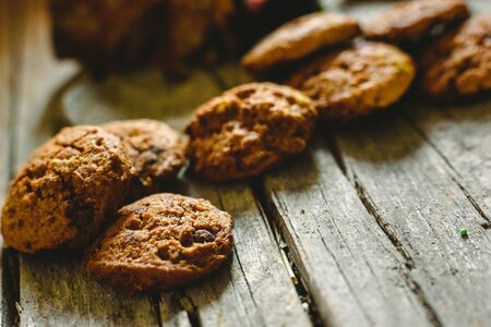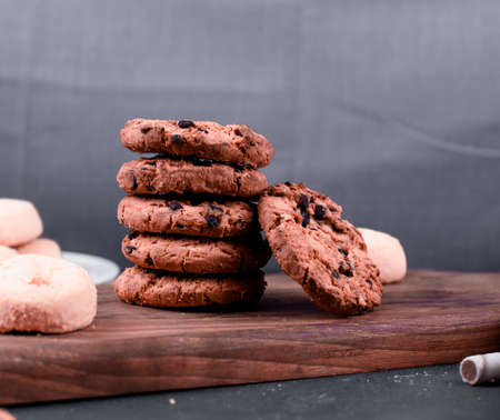 food sweet stuff decor on rough wooden background. chocolate chip cookies on timber surface with free space.