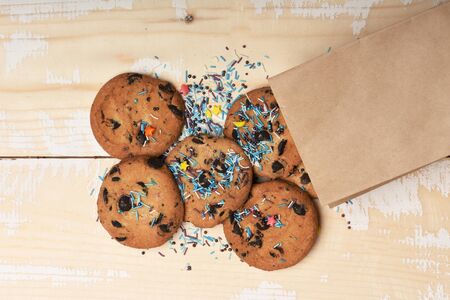 Oatmeal chocolate cookies with colorful sprinkles and crafted package on vintage wooden background