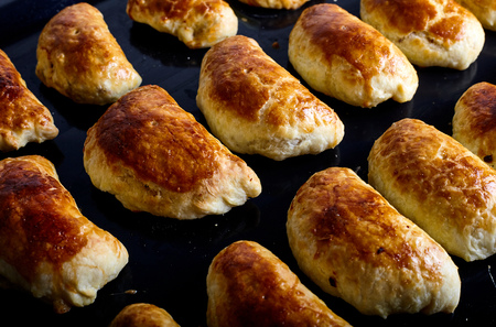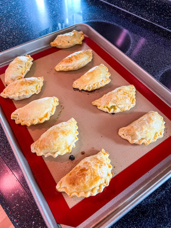 Baking delicious Argentine empanadas with chicken and vegetables.