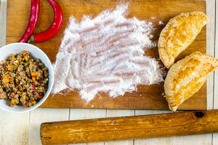 Empanadas cooking preparations: flour with spices, culinary herbs and minced pork on wood board