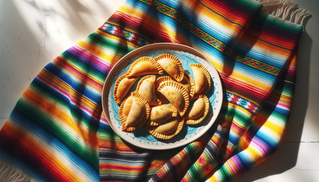 A flat lay view of golden-brown empanadas on a plate, set against the backdrop of a vibrant serape, highlighting the colorful and festive nature of this traditional dish. The natural light enhances the contrast between the crispy crusts and the vivid, striped fabric, creating an inviting and culturally rich presentation.