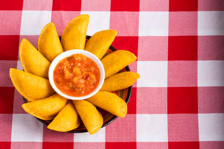 Tasty empanadas on a plate with colorful Mexican cloths as a background. National mexican food.