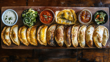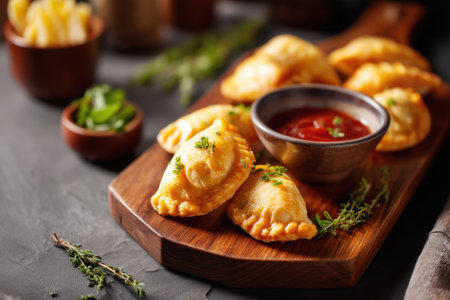 mini empanadas on a wooden board with dipping sauce in small bowls, rustic editorial tone v 7, Generative AI