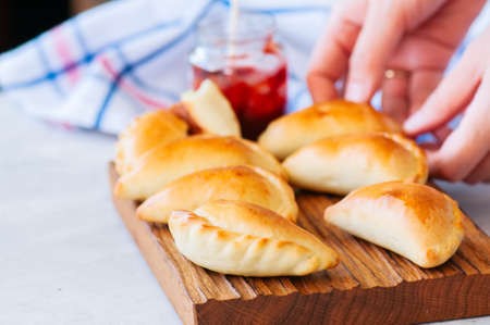 Homemade potato stuffed empanadas with ketchup on a wooden board. White stone background.