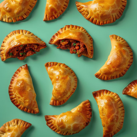 Delicious Empanadas with Beef and Vegetable Filling on Green Background, Latin American Cuisine Food Photography