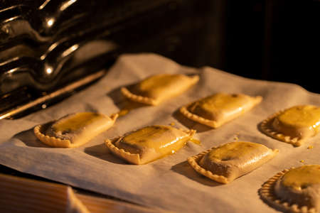 Empanadillas, small filling tuna pies in roasting tray in oven. Cooking process background. Natural atmosphere lifestyle image.