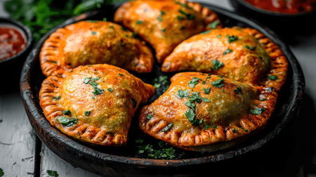 Enjoy a vibrant display of handcrafted empanadas paired with dipping sauces. Perfect for appetizers or snacks, featuring a golden crispy texture and fresh herbs.