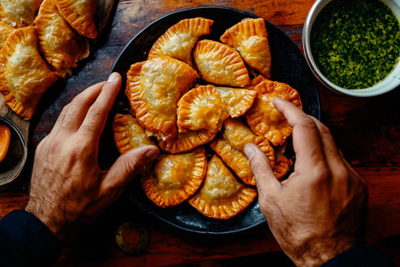 Warm golden empanadas sit invitingly on a rustic plate, with hands poised to savor the delectable treats. The atmosphere is homely, filled with the aromas of freshly cooked pastries.
