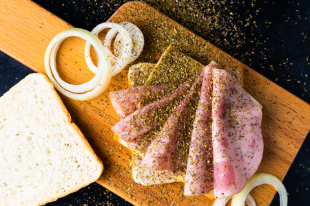 Slices of sausage Mortadella and onion on a cutting board