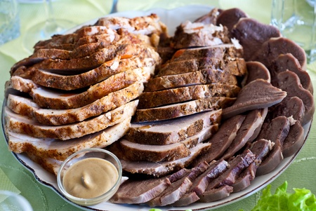 Slices of smoked meat on a plate with vegetables and greens.