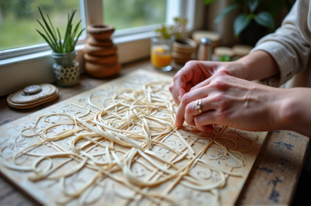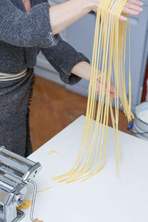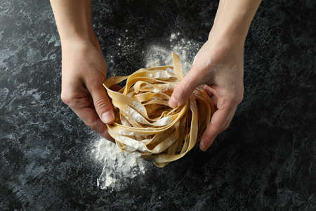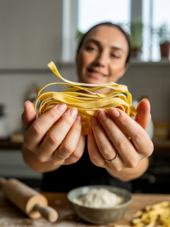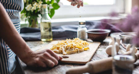 Woman is carefully holding raw fresh homemade noodles in her hands. Concept of process of cooking handmade pasta in a cozy atmosphere