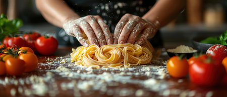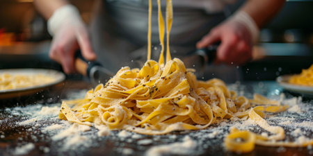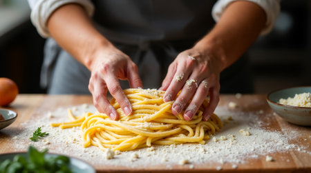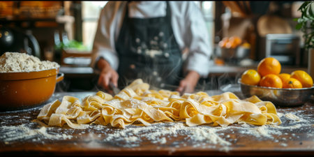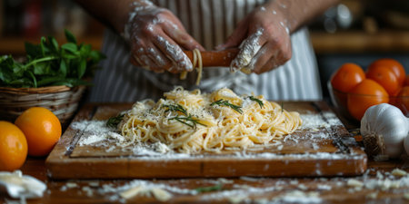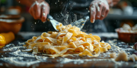 Chef making fresh homemade pasta on wooden cutting board, dusting with flour