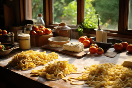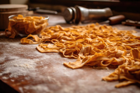 Freshly made pasta resting on a wooden surface ready for cooking and serving with sauce