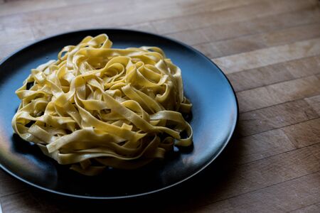 Plain Tagliatelle Pasta in black plate. Organic Spaghetti.