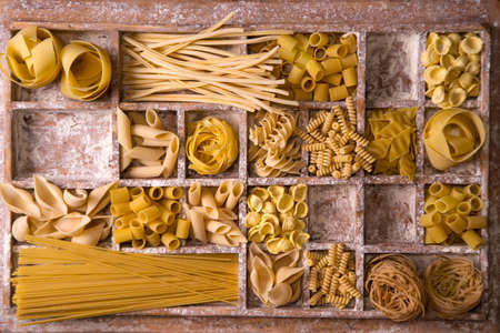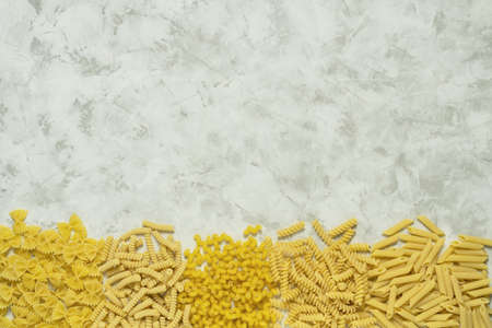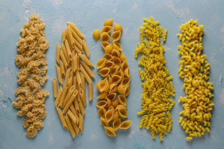 Assorted Italian pasta: Penne rigate, Conchiglie, Cavatappu, Fusilli, Galetti horizontal orientation top view closeup