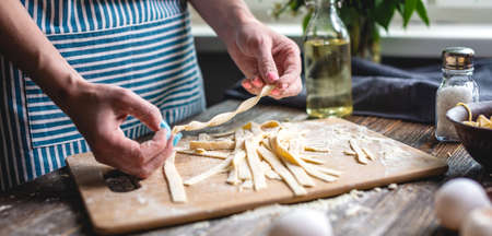 A woman is cutting raw dough with a knife to make homemade noodles. Concept of process of cooking handmade pasta in a cozy atmosphere