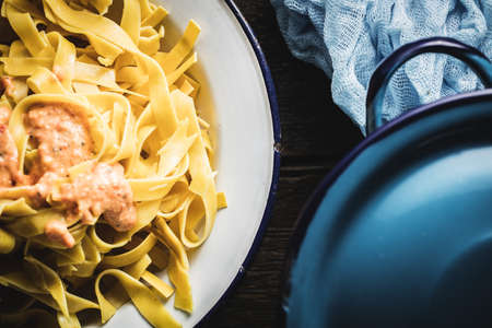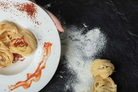Homemade pasta on a wooden background. Italian style cuisine. Restaurant.