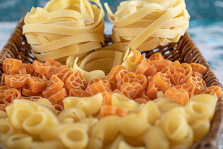 Assortment of raw pasta. Different kinds of macaroni, tagliatelle, farfalle, spaghetti, penne rigate . Colorful, red, green, yellow, noodle.