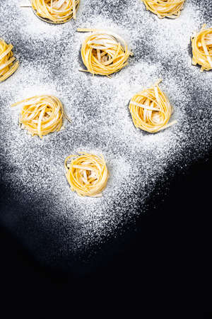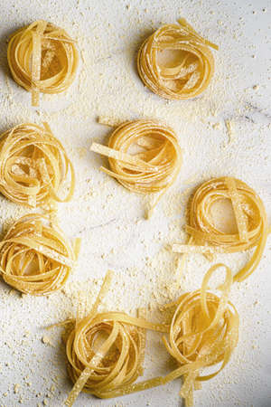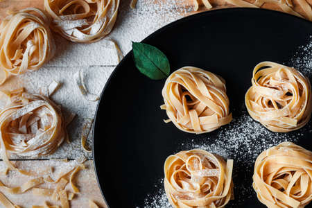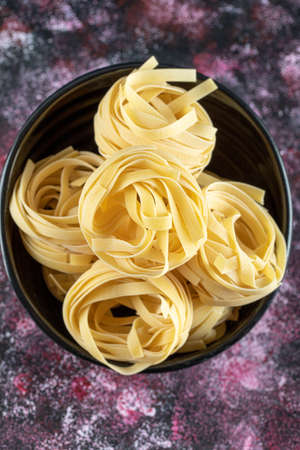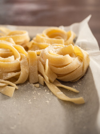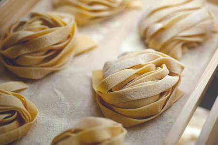 Macro pictore of traditional Italian raw pasta Tagliatelle, selective focus image. Vegeterian food. Nutrition concept. Italian kitchen. Food preparation. Food pasta background. Wallpaper. Tasty.