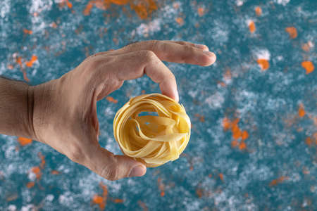 Uncooked pasta. Raw pasta nests with shadow on blue background.
