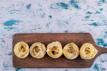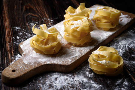 Pasta fettuccine on a cutting board. Pasta on wooden background.