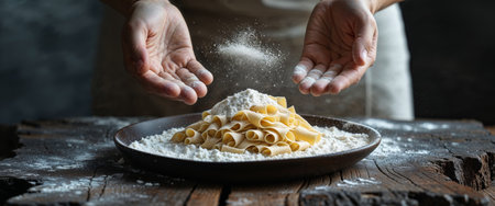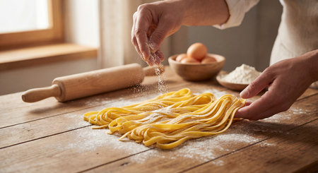 Close-up of hands sprinkling flour over freshly made pasta on a rustic wooden kitchen table, with eggs and flour in bowls nearby, creating a warm and inviting cooking atmosphere