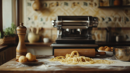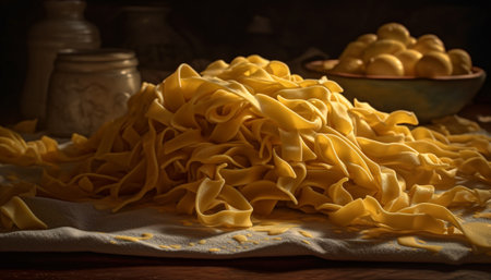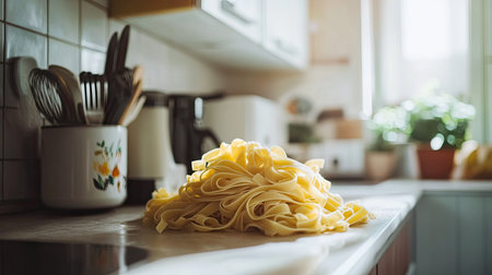A heap of fresh tagliatelle resting on a kitchen counter, with generous copy space on the side for any food-related content or branding, offering a rustic kitchen aesthetic.