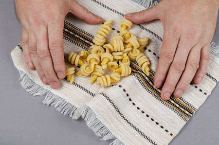 Nodi marini, insalatonde pasta. A portion of pasta on a white ethnic towel with pattern and fringe. Angled view from above.